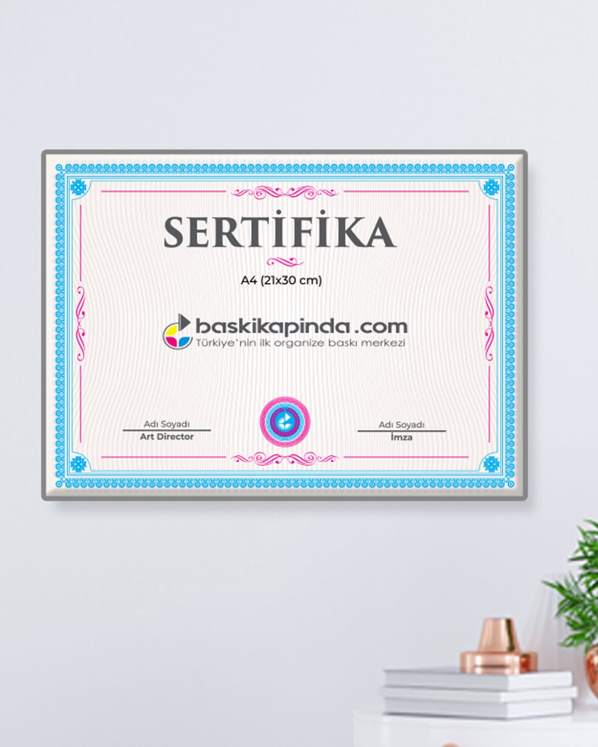 Sertifika üretim süresi; Grafik ve taslak çizim yani tasarımınıza onay verdikten sonra, ödemesi yapılan siparişler onayınızı takiben 3-5 iş günüdür.